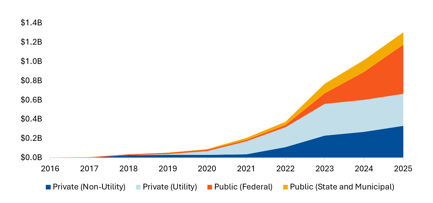 An additional sign of growing momentum in MDHD charging investment in the United States is the significant increase in investments in MDHD charging infrastructure beyond California. The Golden State has long been a leader in transportation electrification across vehicle classes and particularly in MDHD electrification. While California still leads, activity in other states shows that MDHD electrification is happening in a meaningful way elsewhere. Figure 2 shows cumulative estimated investment in MDHD charging by investment type outside of California.