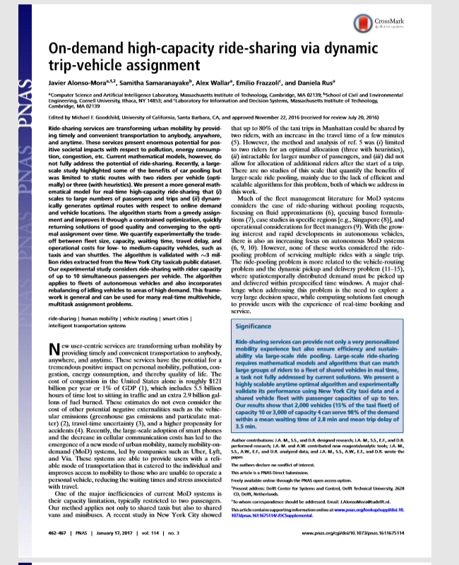 The study presents a model for real-time high-capacity ride-sharing that (i) scales to large numbers of passengers and trips and (ii) dynamically generates optimal routes with respect to online demand...