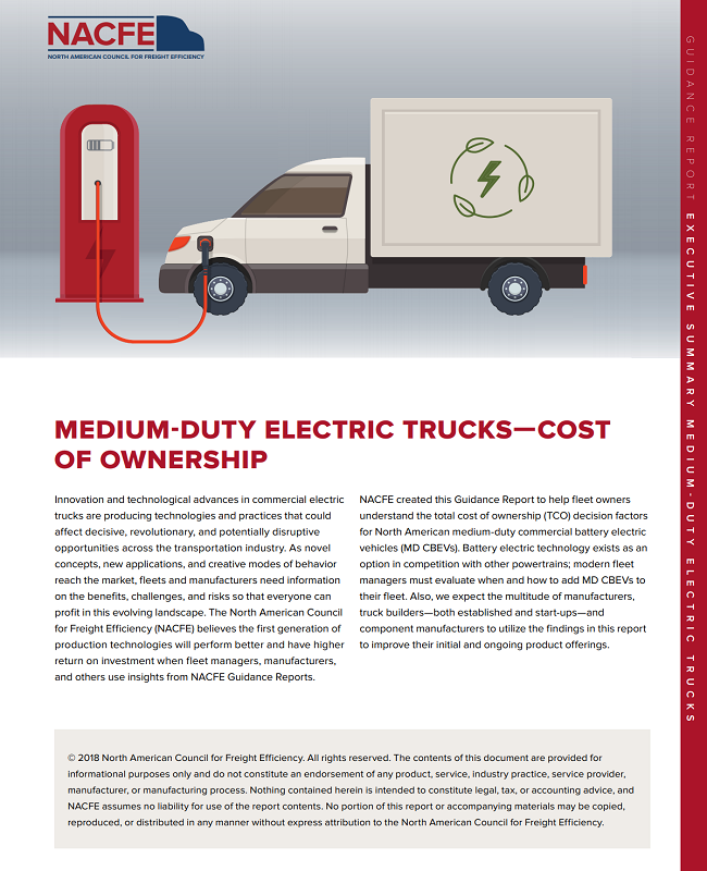 NACFE created this Guidance Report to help fleet owners understand the total cost of ownership (TCO) decision factors for North American medium-duty commercial battery electric vehicles (MD CBEVs). Battery electric technology exists as an option in competition with other powertrains; modern fleet managers must evaluate when and how to add MD CBEVs to their fleet.