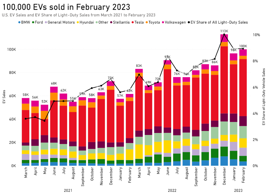 Source: EV Hub We just received February 2023 electric vehicle (EV) sales data, and new trends for 2023 are beginning to emerge. In February 2023, nearly 100,000 light-duty EVs were sold, representing a 9 percent market share for new, light duty EV sales – a 54 percent increase from February 2022. Continue [...]