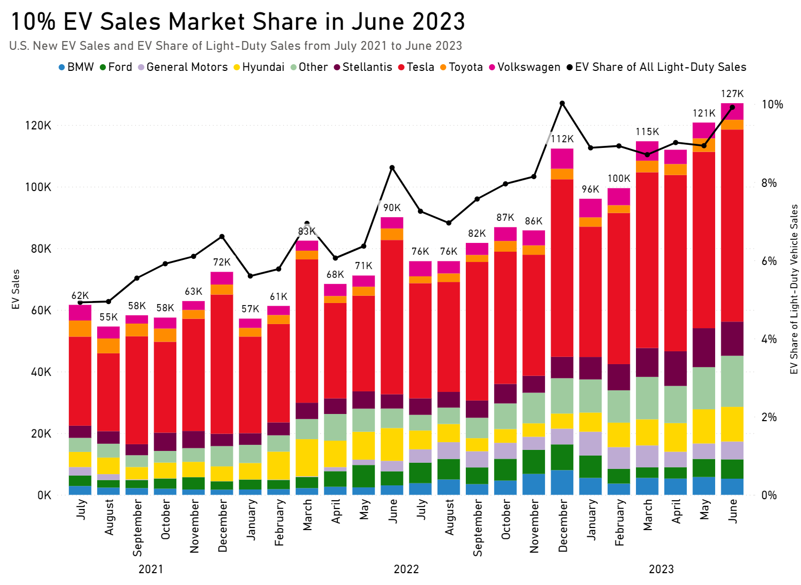 Source: EV Hub June once again proves to be a hot month for electric vehicle (EV) sales. June 2023 recorded the highest-ever EV sales for any single month; the 127,000 EVs sold represented a 10 percent light-duty EV market share, and a 41 percent increase from June 2022 (approximately 90,000 EV sales). [...]