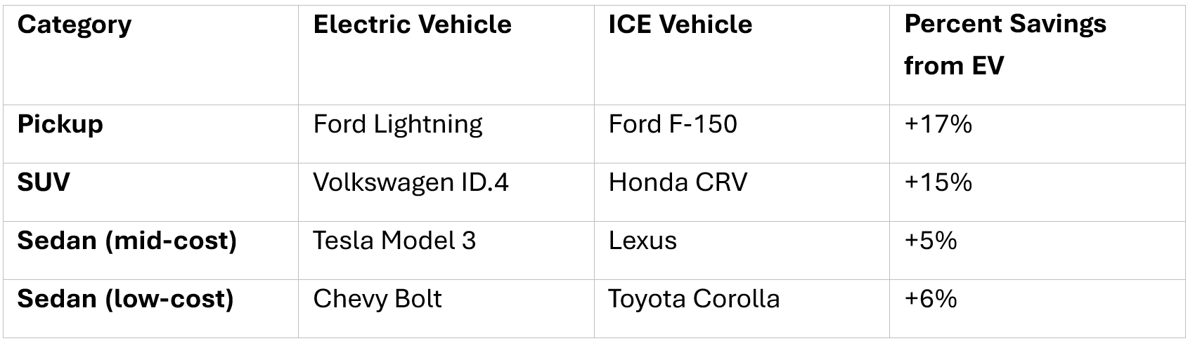 In all four categories, the EV was cheaper than its gasoline counterpart for the total cost of ownership (TCO). Our analysis found the total cost of owning the forthcoming electric version of the Ford F-150 (the F150 Lightning) is 17 percent lower than the gas-powered version, the cost of the electric Volkswagen ID.4, an SUV, is 15 percent less than the Honda CRV, a Tesla Model 3 costs almost 5 percent less than a similar Lexus, and the Chevy Bolt costs 6 percent less than a Toyota Corolla.