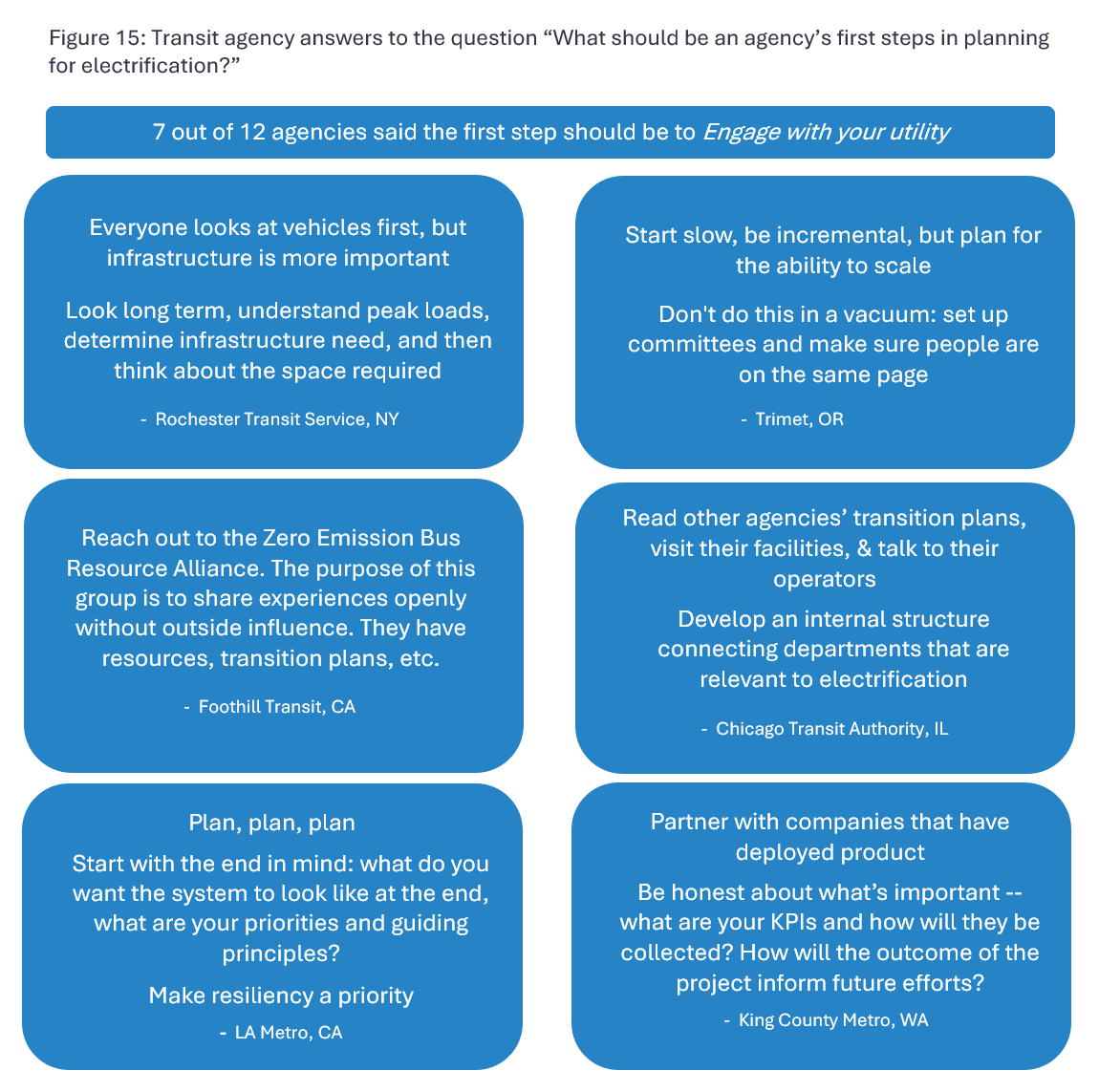 Finally, it is worth noting that the real value of this report for those beginning their electrification journey or designing a battery electric bus deployment program can be learned from the individual experiences and anecdotes described by transit agencies in this report as shown in Figure 15.