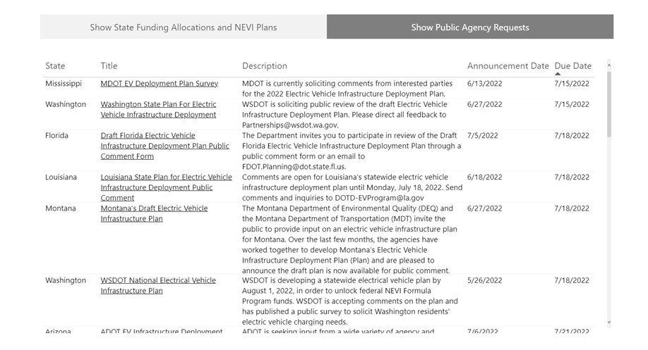 There are currently 21 open requests by states that include surveys and public comment forms to help inform NEVI plan development as well as provide feedback on already issued draft plans. A list of all open requests is available on the EV Hub’s NEVI Dashboard. States that have open requests for input and feedback include Arizona, Connecticut, Florida, Idaho, Louisiana, Maryland, Missouri, Montana, Nebraska, New Mexico, New York, North Carolina, North Dakota, South Dakota, Vermont, Virginia, Washington, Wisconsin and Wyoming.